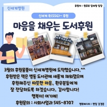<마음을 채우는 도서후원>신세계병원에 따뜻한 후원물품이 전달되었습니다.소설 및 시집 등 다양한 책이 도착하여병동 도서관에 새롭게 채워졌습니다!후원해주신 따뜻한 마음,환우분들을 위해 사용하도록 하겠습니다.감사합니다!후원문의 : 사회사업과 545-8707