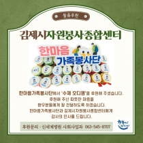 <'한마음가족봉사단- 수제오디잼' 후원>김제시자원봉사종합센터를 통해‘한마음가족봉사단 - 수제 오디잼’을 후원해주셨습니다.신세계병원은 김제시자원봉사종합센터 자원봉사수요처로서 자원봉사자들과의 교류를 통해지역사회 내 자원연계와 자원봉사활동들을 진행하고 있습니다.후원해주신 오디잼은 어르신병동 환우분들에게 제공하여따스함을 전할 수 있었습니다.후원해주신 ‘김제시자원봉사...