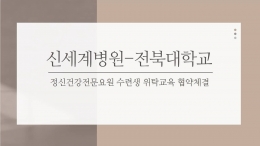 < 전북대학교 - 신세계병원 정신건강전문요원 수련생 위탁교육 협약>2021년 03월 25일(목) 신세계병원과 전북대학교병원이정신건강전문요원(간호사) 수련과정 현장실습을 위하여 위탁교육 협약을 체결하였습니다.신세계병원에서는 지역사회와의 협력을 통하여 임상경험을 위한 교육기회를 제공함으로써정신건강 전문인력을 양성하는데 노력하고 있습니다.