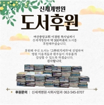 <여산중앙교회 이경원목사님의 도서 후원>여산중앙교회 이경원목사님께서 신세계병원에 약 300여권의 도서를 후원해주셨습니다.후원해주신 도서는 ‘그루터기서가’에 진열하여 병원 이용객들과 환우들이 자유롭게 감상할 수 있도록 하겠습니다.감사합니다.후원문의: 신세계병원 사회사업과 063-545-8707