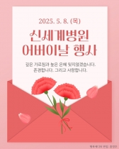 <어버이날 행사>신세계병원은 2025. 5. 8.(목) 어버이날 행사를 진행하였습니다.1부에서는 감사한 마음을 담아 카네이션을 한 분 한 분에게 전달하였고,어버이날에 대한 선생님들이 '어버이 은혜' 노래를 불러 전달하였습니다.이후에는 맛있는 간식과 함께 노래자랑을 통해 즐거운 시간을 가졌습니다.2부에서는 통기타스케치 공연팀의 통기타와 색소폰 연주가 따뜻한 멜로디로환우분들께 사랑...