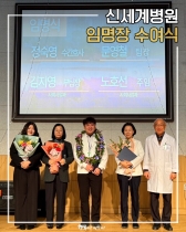 <신년 아침조회_임명장 수여식>26년 1월 7일(수), 신년 아침조회에서 신세계병원의 새로운 리더십을 맡게 되신 네 분의 선생님들에 대한 임명식이 진행되었습니다.* 간호부- 정숙영 수간호사* 원무부- 문영철 팀장* 사회사업과- 김지영 부팀장- 노호선 주임신세계병원은 각 병동과 부서의 전문성을 강화하고, 환자 중심의 치료환경을 만들기 위해 전문 인력의 성장과 리더십을 아낌없이 응...