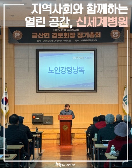 <지역사회와 함께하는 열린 공간, 신세계병원> 2026년 2월 26일(목), 대한노인회 김제시지회 금산면 경로회장 정기총회가 신세계병원에서 진행되었습니다. 신세계병원에서 열린 이번 총회에는 지역 어르신 60여 분이 참석해 서로의 안부를 나누고, 지역사회의 발전 방향을 함께 모색하는 뜻깊은 시간을 가졌습니다. 신세계병원은 정신건강의학과, 노인, 알코올, 발달장애 등 다양한 영역의 진료를 통해 지역주민의 마음건강과 삶의 질 향상을 위해 노력하고 있습니다. 신세계병원은 앞으로도 지역 어르신들의 건강과 행복을 위해 지역사회와 함께 소통하며 건강한 공동체를 만들어가...
