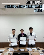 신세계병원 (사)전북노인복지효문화연구원 협약식2025년 10월 16일(목),신세계병원은 (사)전북노인복지효문화연구원과 뜻깊은 협약식을 가졌습니다.이번 협약은 어르신들의 건강한 삶을 지켜드리고,더불어 ‘효(孝)’ 문화를 지역사회 속에 널리 퍼뜨리기 위한 마음을 담고 있습니다.신세계병원은 치료와 회복을 넘어, 지역사회와 함께 따뜻한 가치를 나누는 것이 병원의 중요한 역할이라 생각합니다.이번 협...